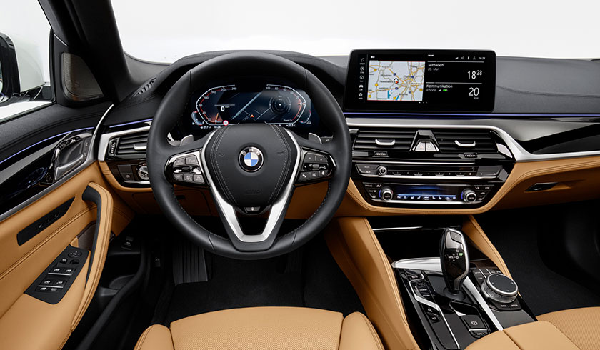 Наибольшие изменения скрываются в салоне обновлённых автомобилей 5 серии. В отделки интерьера используются другие материалы, передняя панель обзавелась виртуальными приборами, а приборный щиток получил 12.3 дюймовый жидко-кристаллический дисплей, была оптимизирована навигационная система и добавлен Android Auto. Пульт климат-контроля остался прежним, но обзавёлся расширенными функциями, зато изменились пульты управления круиз-контролем и аудио.